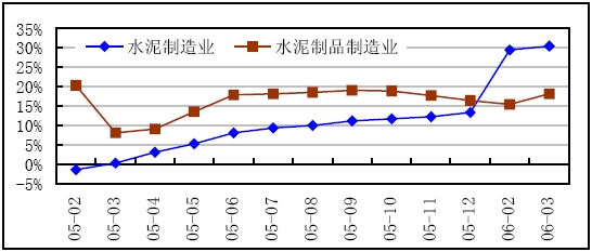 2005年以來水泥制造業(yè)和水泥制品制造業(yè)工業(yè)總產(chǎn)值增長對比