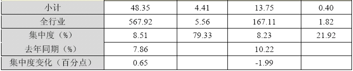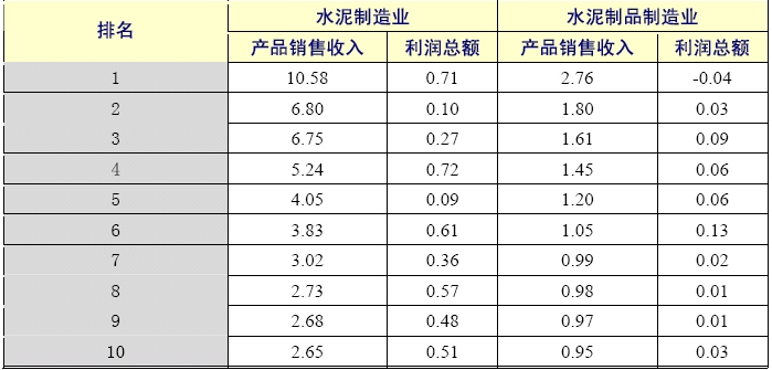 1季度,水泥制造業(yè)前10家企業(yè)銷(xiāo)售收入集中度比去年同期略有提升,利潤(rùn)集中度則更是高達(dá)近8成。而水泥制品制造業(yè)前10家企業(yè)銷(xiāo)售收入集中度比去年同期則有所下滑,實(shí)現(xiàn)利潤(rùn)只占行業(yè)總體的2成多。 水泥制造業(yè)前10家企業(yè)銷(xiāo)售收入為48.35億元,集中度為8.51%,比去年同期上升了0.65個(gè)百分點(diǎn),比上季度末上升了3.57個(gè)百分點(diǎn);實(shí)現(xiàn)利潤(rùn)為4.41億元,集中度為79.33%,比上季度末上升了77.14個(gè)百分點(diǎn)。水泥制品制造業(yè)前10家企業(yè)銷(xiāo)售收入為13.75億元,集中度為8.23%,比去年同期下降了1.99個(gè)百分點(diǎn),比上季度末上升了1.84個(gè)百分點(diǎn);實(shí)現(xiàn)利潤(rùn)為0.40億元,集中度為21.92%,比上季度末上升了19.95個(gè)百分點(diǎn)。