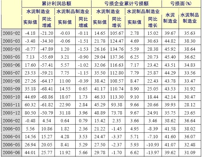 2006年1-6月,水泥制造業(yè)累計利潤總額為44.01億元,比上年同期增加了25.77億元;虧損企業(yè)累計虧損總額為29.78億元,比上年下降了1.70%;企業(yè)虧損面仍然較大,為39.62%,但是比上年同期下降了3.89個百分點。