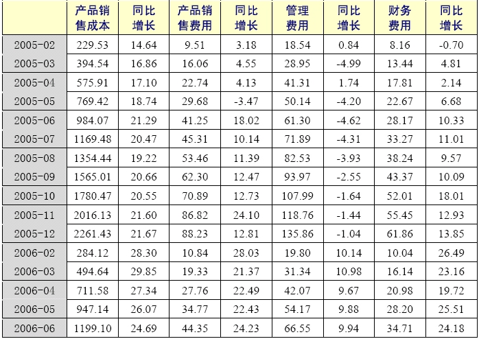 2006年1-6月,水泥制造業(yè)累計(jì)產(chǎn)品銷售成本為1199.10億元,同比增長(zhǎng)24.69%,增幅比上年同期只上升了近3.4個(gè)百分點(diǎn);累計(jì)產(chǎn)品銷售費(fèi)用為44.35億元,同比增長(zhǎng)24.23%,增幅比上年同期上升了6.21個(gè)百分點(diǎn);累計(jì)管理費(fèi)用為66.55億元,同比增長(zhǎng)9.94%;累計(jì)財(cái)務(wù)費(fèi)用為34.71億元,同比增長(zhǎng)24.18%。 2006年,水泥制造業(yè)成本上漲壓力較大,行業(yè)成本增長(zhǎng)相對(duì)較快。由于銷售收入增速加快,銷售成本增速及費(fèi)用也相應(yīng)上升,但增幅均小于銷售收入的增幅。
