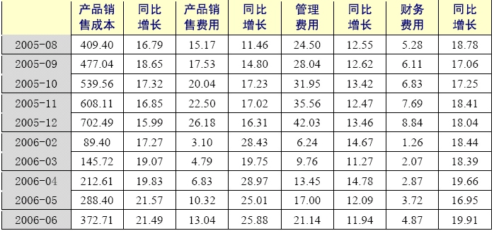 2006年1-6月,水泥制品制造業(yè)累計(jì)產(chǎn)品銷售成本為372.71億元,同比增長21.49%,增幅比上年同期上升了2.73個百分點(diǎn);累計(jì)產(chǎn)品銷售費(fèi)用為13.04億元,同比增長25.88%;累計(jì)管理費(fèi)用為21.14億元,同比增長11.94%;累計(jì)財(cái)務(wù)費(fèi)用為4.87億元,同比增長19.91%。除了財(cái)務(wù)費(fèi)用增幅低于水泥制造業(yè),其他費(fèi)用增幅均高于水泥制造業(yè),累計(jì)產(chǎn)品銷售成本增幅也低于水泥制造業(yè)。