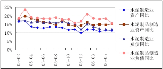 2006-2006年水泥制造業(yè)和水泥制品制造業(yè)資產(chǎn)、負債同比增長情況