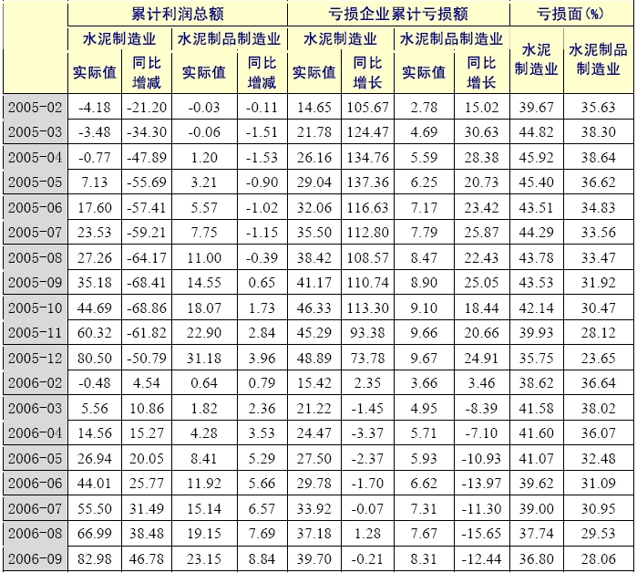 2006年1-9 月,水泥制造業(yè)行業(yè)經(jīng)營情況好于上年同期。累計(jì)利潤總額為82.98 億元,比上年同期增加了46.78 億元;虧損企業(yè)累計(jì)虧損總額為39.70 億元,比上年下降了0.21%;企業(yè)虧損面仍然較大,為36.80%,但是比上年同期下降了6.73 個百分點(diǎn)。