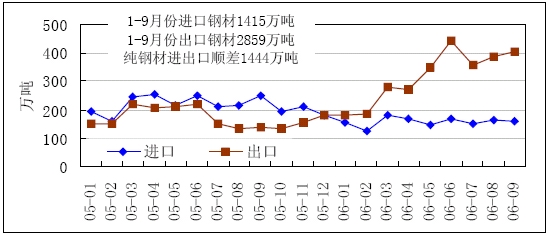 2005年1月-2006年9月全國鋼材進(jìn)出口逐月走勢