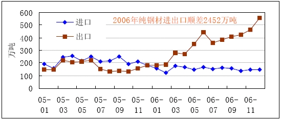 根據(jù)發(fā)展態(tài)勢(shì)初步預(yù)測(cè),2007年我國(guó)鋼材進(jìn)口量將維持在1800萬(wàn)噸左右,鋼材出口將達(dá)到6000萬(wàn)噸左右,總體貿(mào)易順差將高達(dá)4200萬(wàn)噸左右,即凈出口量約占估算生產(chǎn)總量5億噸的8.4%左右,再創(chuàng)歷史新高。