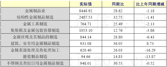 2006年,截止四季度末,金屬制品業(yè)共完成工業(yè)總產(chǎn)值8448.9億元,同比增長28.62%,增速比上年同期下降了1.18個百分點。