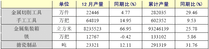 2006年,金屬制品業(yè)主要產(chǎn)品產(chǎn)量大多保持穩(wěn)定增長。從12月份增長情況看,增長較快的產(chǎn)品分別為金屬集裝箱(66.95%]、手工工具(14.95%]、搪瓷制品(12.11%]。從全年累計增長情況,增長較快的產(chǎn)品分別是搪瓷制品(31.76%]、金屬切削工具(29.46%)、金屬集裝箱(25.78%)。