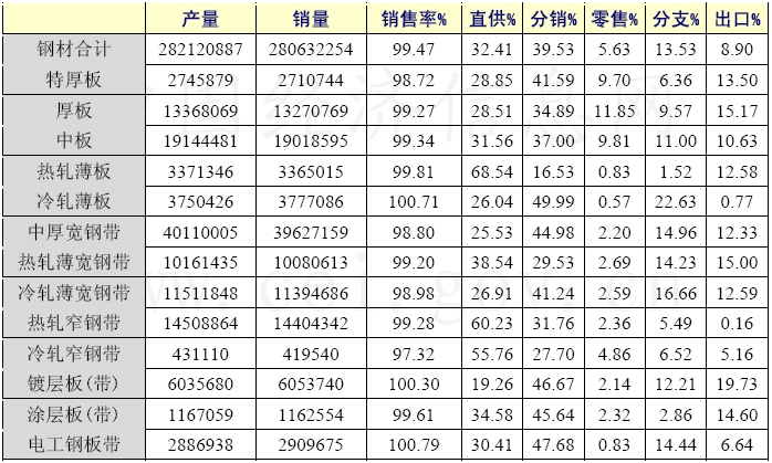 在重點統(tǒng)計單位中屬于企業(yè)直供銷售占32.41%,比例有所提高,通過流通環(huán)節(jié)銷售的占45.16%,分支機構(gòu)銷售占13.53%,出口占8.90%,出口比例略有提高,重點統(tǒng)計單位的鋼材銷售方式表明,目前全國鋼鐵企業(yè)的銷售方式主要是通過流通環(huán)節(jié)銷售鋼材,通過企業(yè)直供和分支機構(gòu)銷售鋼材的比重不大。