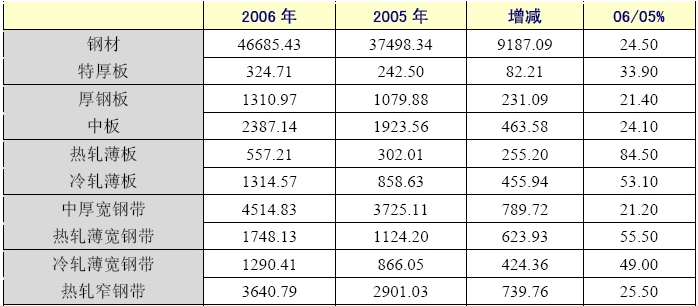 從分品種看,2006年產(chǎn)量增幅最大的板材是熱軋薄板、熱軋薄寬鋼帶、冷軋薄板、冷軋薄寬鋼帶、鍍層板帶,分別同比增長了84.50%、55.50%、53.10%、49.00%和43.60%。