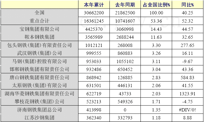 2006年,全國(guó)冷軋薄板帶產(chǎn)量3066.22萬(wàn)噸,同比增長(zhǎng)40.25%,重點(diǎn)統(tǒng)計(jì)企業(yè)產(chǎn)量1636.12萬(wàn)噸,同比增長(zhǎng)52.32%,增幅高于全國(guó)平均水平,但產(chǎn)量只占全國(guó)產(chǎn)量的53.36%。其中重點(diǎn)企業(yè)冷軋薄寬帶鋼產(chǎn)量占全國(guó)產(chǎn)量99.10%。分企業(yè)看寶鋼產(chǎn)量最高為442.54萬(wàn)噸,占全國(guó)產(chǎn)量的14.43%,鞍本集團(tuán)356.60萬(wàn)噸,占全國(guó)11.63%,包鋼產(chǎn)量躍居第三占全國(guó)3.30%,武鋼占3.26%。
