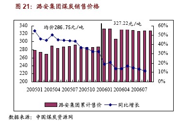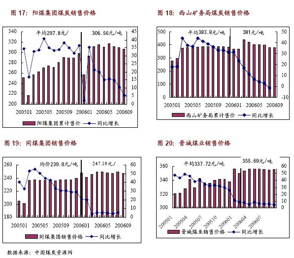 從山西煤炭企業(yè)的銷售價格來看,2006年前9 個月,陽煤集團(tuán)、西山礦務(wù)局、同煤集團(tuán)、晉城煤業(yè)和潞安集團(tuán)的銷售價格分別為306.56 元/噸、381 元/噸、247.19 元/噸、355.69 元/噸和327.22 元/噸,較05 年均價分別增長8.76 元/噸,-2.41 元/噸(煉焦煤價格壓力較大)、7.39 元/噸、17.97 元/噸和40.47 元/噸(潞安加大了煙煤噴吹銷量)。除了西山礦務(wù)局的價格小幅下跌外,其他四大集團(tuán)的價格都有不同程度的上漲。