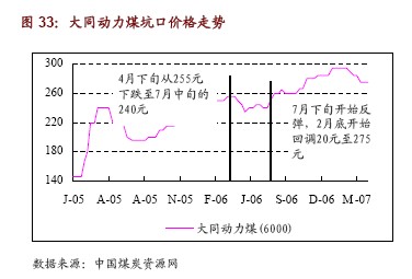 ?? 07年4 月30,大同動力煤坑口價(不含稅)為275 元/噸,較1 月份的高點295 元/噸下降了20 元/噸。目前價格較06 年7 月份的低點240 元/噸上漲了35 元/噸,漲幅達到14.58%,基本穩(wěn)定。