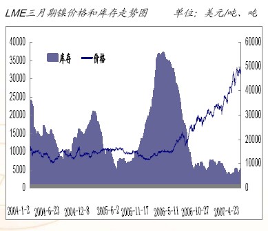 2007年1~2月份我國進口鎳精礦達到117萬噸,同比增加3150%;1~3月,我國進口精煉鎳2.95萬噸,同比增長46.7%;同期我國原生鎳產量為3.01萬噸,同比增長25.9%,而1月份我國鎳表觀消費量就達到2.75萬噸,同比增加了62%!爸袊蛩亍焙臀磥礞嚿a成本的提高將是鎳價易漲難跌的一個重要原因。