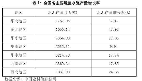 2007年1-3月我國(guó)共生產(chǎn)水泥熟料19324.18萬(wàn)噸,比去年同期增長(zhǎng)了14.54%。省市產(chǎn)量排在前五位的依次為山東省、廣東省、安徽省、江蘇省、浙江省;增長(zhǎng)最快的五個(gè)省分別是:寧夏回族自治區(qū)、吉林省、甘肅省、遼寧省、福建省,同比增長(zhǎng)率分別達(dá)到102.68%、59.94%、42.84%、41.40%和35.54%。相對(duì)而言,東北地區(qū)的產(chǎn)量增長(zhǎng)較快,同比增幅達(dá)47.93%。