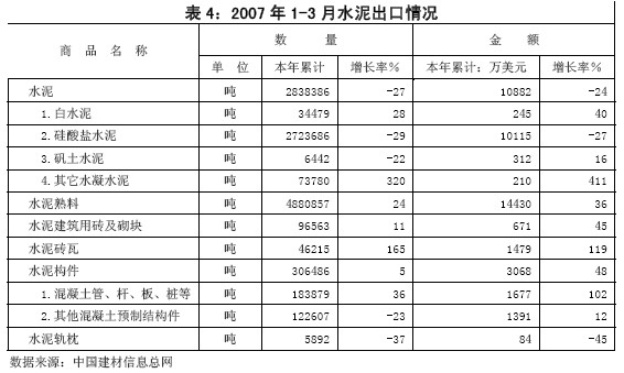 鑒于美國(guó)經(jīng)濟(jì)增速放緩、人民幣升值、國(guó)內(nèi)水泥價(jià)格上漲、國(guó)外大量水泥項(xiàng)目投產(chǎn)等因素的影響,預(yù)計(jì)2007年我國(guó)水泥和熟料出口很可能出現(xiàn)大幅下降。