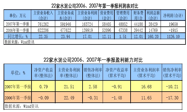 值得關注的是,今年一季度的合計主營業(yè)務成本較上年同期上漲了23.94%,漲幅超過同期主營業(yè)務收入漲幅,但同期營業(yè)費用、管理費用和財務費用僅分別同比上漲12.11%、1.51%和12.01%,價格上漲及費用下降依然是拉動2007年一季度水泥公司業(yè)績增長的主要原因。