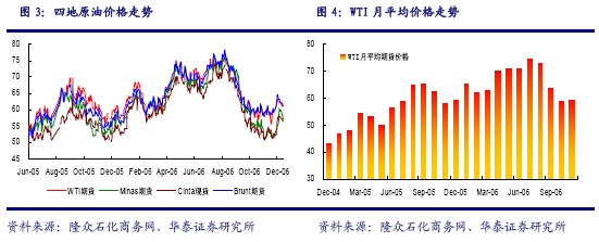 到06年12 月為止,原油價格雖然也一度出現(xiàn)了小幅的回升,但并未如之前外界所預(yù)料的那樣再度強勁回升到65 美元/桶以上的臺階,而且到12月紐約市場原油期貨價格最低曾收在55.8 美元/桶,這已經(jīng)是17 個月以來的最低點。這一方面與今年冬天北半球氣溫較暖有關(guān),但主要的還是國際地緣政治、操作資金退出等各方面因素以及由此而生的預(yù)期因素共同作用的結(jié)果。