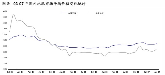 數(shù)據(jù)顯示,07年1-4月份水泥均價(jià)(PO42.5)同比上漲約7元/噸,而06年同期的漲幅約2元/噸,國(guó)內(nèi)水泥價(jià)格進(jìn)一步回升的態(tài)勢(shì)明顯。??對(duì)07年國(guó)內(nèi)水泥價(jià)格年漲幅區(qū)間的判斷維持在3-4%的水平,相當(dāng)于8-10元/噸的價(jià)格上漲幅度。