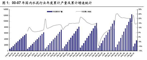 2007年1-4月,國內(nèi)水泥累計產(chǎn)量為3.59億噸,同比增長為14.4%,增幅同比下降7.4個百分點,較06年全年增速下降1.1個百分點。??目前的水泥產(chǎn)量增速仍處于2000年以來的較高水平,預(yù)期07年國內(nèi)水泥產(chǎn)量增速約12-13%,盡管數(shù)值略低于06年,但仍屬于高增長的水平。