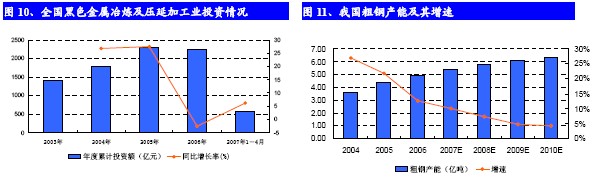 2007年1-5月投資增速4.6%。而且目前的鋼鐵行業(yè)投資主要集中于下游的軋鋼領(lǐng)域,用于粗鋼產(chǎn)能的投資增長有限。結(jié)合國家鋼鐵行業(yè)產(chǎn)能淘汰政策,預(yù)計未來幾年我國鋼鐵業(yè)產(chǎn)能增長將進(jìn)入平穩(wěn)期,粗鋼產(chǎn)量增速預(yù)計在5~10%之間,生鐵產(chǎn)量增速預(yù)計在8~14%之間。