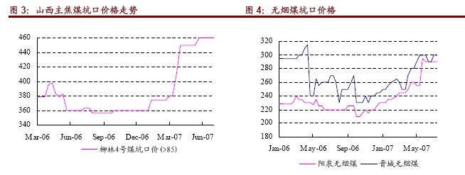 7 月20 日,柳林四號煤坑口不含稅價(jià)格為460 元/噸,近兩個月維持穩(wěn)定,但較3 月底上漲了50元/噸,較去年年底上漲了100 元/噸。