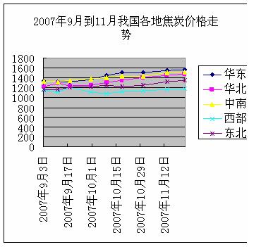 1.焦炭?jī)r(jià)格不斷上漲 在07年9月份,焦炭市場(chǎng)行情步入大幅上漲的局面,部分焦化企業(yè)已經(jīng)調(diào)整30至50元/噸左右,隨后華東及河北部分地區(qū)上漲30至40元/噸,東北地區(qū)也在觀望后也上調(diào)50元/噸左右。另外,華北地區(qū)的焦化企業(yè)經(jīng)過(guò)艱苦談判,“八五”之爭(zhēng)在鋼廠用戶接受80元/噸漲幅的協(xié)議下結(jié)束。至此,焦炭市場(chǎng)新的一輪價(jià)格上漲基本完成,市場(chǎng)逐漸進(jìn)入盤整局面。10月到11月中旬,全國(guó)的焦炭?jī)r(jià)格保持了比較穩(wěn)定的增長(zhǎng)態(tài)勢(shì)(參見下圖);诿禾糠植嫉牟黄胶猓鞯氐氖袌(chǎng)價(jià)格每噸也相差十幾元到上百元不等,尤其是焦炭需求比較旺盛的華東地區(qū)和煤炭資源豐富的地區(qū)基本保持了每噸上百元的差距。