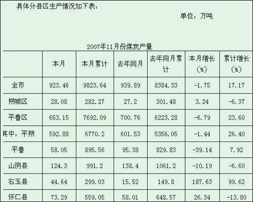從1-11月份煤炭產(chǎn)銷情況來看,全市煤炭的增長幅度比上月略有下降。2007年,朔州煤炭市場運行平穩(wěn),產(chǎn)銷保持穩(wěn)定增長。
