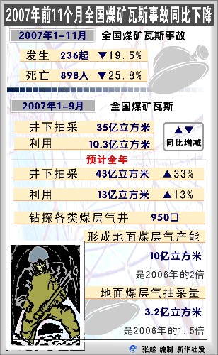 12月24日 圖表:2007年前11個(gè)月全國(guó)煤礦瓦斯事故同比下降