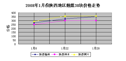 2008年1月份陜西地區(qū)煙煤38塊價格走勢整體呈上升趨勢。月初至月底整體攀幅50-90元/噸左右。由圖表看出,上半月整體漲勢較快,,攀幅在50元/噸左右。下半月整體漲勢趨緩。陜西銅川地區(qū)出礦含稅價格較高,由月初的290元/噸上漲至月底的360-380元/噸。攀幅為70-90元/噸。