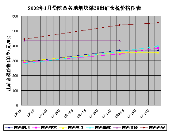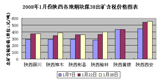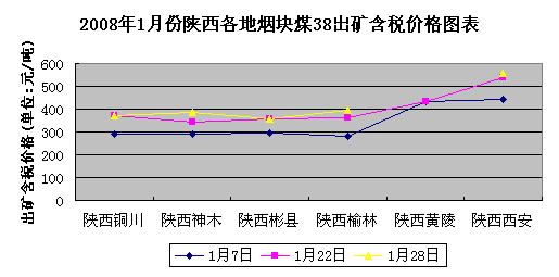 2008年1月份陜西各地?zé)熋簤K38出礦含稅價(jià)格整體呈上揚(yáng)趨勢