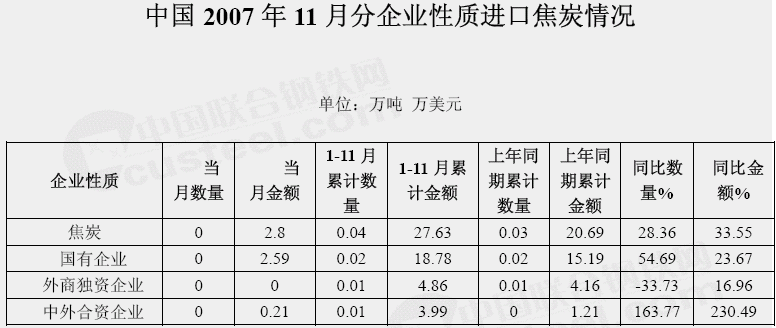 2007年11月份我國焦炭進口分企業(yè)性質(zhì)數(shù)據(jù)統(tǒng)計情況