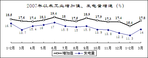 發(fā)電量增速減緩,效益明顯下降。全國發(fā)電量8051億千瓦時,增長14%,減緩1.5個百分點;其中,火電、水電分別增長13.4%和11.4%。由于受災(zāi)電網(wǎng)全面恢復(fù)正常和災(zāi)后恢復(fù)重建等多方面因素,電力需求呈快速增長之勢。3月份,廣東、廣西、云南、貴州4個省級電網(wǎng)出現(xiàn)拉限電,其中廣東電力供應(yīng)持續(xù)偏緊。前兩個月,由于煤炭價格上漲和低溫雨雪冰凍災(zāi)害造成嚴(yán)重?fù)p失,電力行業(yè)實現(xiàn)利潤95.4億元,下降55.9%,去年同期為增長59.2%。其中,電力生產(chǎn)業(yè)、電力供應(yīng)業(yè)利潤分別下降70.6%和37.6%,去年同期為增長40.1%和89.8%。