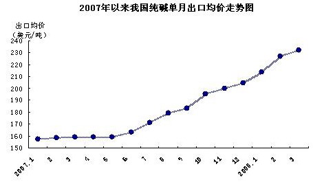 據(jù)海關(guān)統(tǒng)計(jì),2008年1季度我國累計(jì)出口純堿46.7萬噸,價(jià)值1億美元,比去年同期(下同)分別增長4.1%和47.5%,出口平均價(jià)格為224.5美元/噸,同比上漲41.7%。其出口主要特點(diǎn)是: