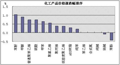 監(jiān)測的主要化工產品中,價格上漲的有10種,持平的有3種,下跌的有2種。具體來看,苯酐、甲醇、普通聚苯乙烯價格漲幅居前,分別較前一周上漲1.0%、0.9%和0.8%;苯酚、燒堿價格分別較前一周下跌0.3%、0.1%。