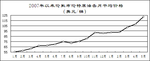5月份,全國原油產(chǎn)量同比增長1.8%,增速比上月加快1.5個百分點(diǎn);原油加工量下降1.1%,其中汽油產(chǎn)量下降6.4%,柴油產(chǎn)量增長2.6%。天然氣產(chǎn)量增長12%,減緩1.4個百分點(diǎn)。國際油價不斷攀高。WTI原油價格5月22日一度達(dá)到135.03美元/桶,為全月最高水平,再創(chuàng)歷史新高。當(dāng)月布倫特原油平均價122美元/桶,比上月上漲13.2美元/桶,漲幅為12.2%;同比上漲54.2美元/桶,漲幅為80%。