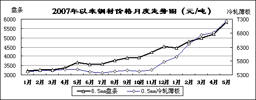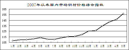 5月份,全國粗鋼產(chǎn)量同比增長10.5%,增速比上月加快0.3個百分點(diǎn);鋼材產(chǎn)量增長13.6%,加快1.9個百分點(diǎn)。鋼材出口556萬噸,比上月增加78萬噸;進(jìn)口2萬噸,與上月持平。鋼材價格漲勢不減。月末,國內(nèi)市場鋼材價格綜合指數(shù)156.86點(diǎn),比上月末上漲10.38點(diǎn),比年初上漲31.74點(diǎn),同比上漲43.52點(diǎn)。6.5mm盤條、10mm中板、0.5mm冷軋薄板平均價分別為5832元/噸、6702元/噸和7221元/噸,比上月末上漲12%、6.2%和6%,同比上漲59.1%、47.7%和31.6%。