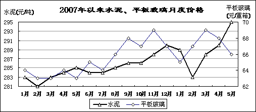 5月份,全國水泥產(chǎn)量同比增長7.5%,增速比上月減緩3.3個百分點(diǎn);平板玻璃產(chǎn)量增長14.3%,加快7.2個百分點(diǎn)。水泥價格上漲較多,平板玻璃價格回落。當(dāng)月重點(diǎn)建材企業(yè)水泥平均出廠價295元/噸,比上月上升5元/噸,同比上升10元/噸;平板玻璃出廠價66元/重量箱,比上月回落2元/重量箱,同比上升3元/重量箱。