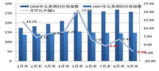 2、 前三個季度美國經濟減速明顯,二季度經濟增長修正后的數(shù)值為2.8%,比早先估計的數(shù)值大約縮水了0.5個百分點。三季度增長預計低于1%。然而受惠于粗鋼產量增長較慢的形勢,北美鋼材市場價格回落走勢遠遠小于亞洲市場。美國粗鋼產量在6月和9月為同比負增長,除1月份外其他月份增長也明顯低于全球同期增長速度。1-9月美國粗鋼產量同比增長4%,增速低于全球產量增速0.6個百分點。同時,鋼材庫存和進口數(shù)量始終處于較低水平,資源供求基本平衡成為鋼價高位運行的主要原因。9月末,CRU北美鋼材綜合價格指數(shù)降至263.8點,環(huán)比上月降幅達3.86%,同比上升54.99%。1-9月平均價格指數(shù)為258.7點,同比上升75.27%。