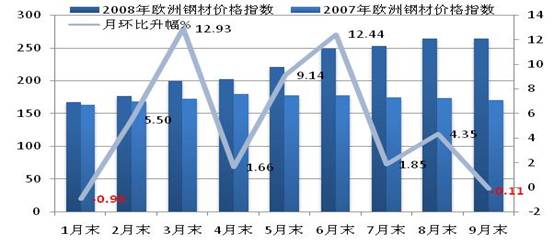 歐洲地區(qū)受美國金融危機的影響經濟增長明顯減速,根據(jù)歐盟統(tǒng)計局的數(shù)字,二季度歐元經濟區(qū)經濟較一季度下降0.2%,是至1995年有統(tǒng)計記錄以來歐元區(qū)經濟季度環(huán)比首次出現(xiàn)負增長,預計三季度將會再次出現(xiàn)負增長。英國三季度環(huán)比季降0.5%,是近年來首次經濟負增長,德國、法國和意大利等國家經濟增長也陷于停滯和負增長的困境。歐盟(27國)1-5月粗鋼產量同比降低了0.7%,6-7月和第三季度產量略有增加,同比增長了2.1%;1-9月粗鋼產量同比僅增長了1.2%。在進口下降和出口增長的情況下,資源供需基本平衡。廢鋼等原料價格大幅回落,今年前7個月,國際市場廢鋼、生鐵價格一路攀升,7月初CRU廢鋼價格指數(shù)曾達到496點,同比上升了1.12倍;8-9月廢鋼價格迅速回落,9月末至322.3點,但仍比上年同期上升了38.0%。廢鋼成本上升對鋼材價格形成有利支撐,但很顯然支撐的力度在減弱。至9月末,CRU歐洲鋼材綜合價格指數(shù)降至263.8點,環(huán)比上月降幅0.11%,同比上升54.99%。1-9月平均價格指數(shù)為221.8點,同比上升48.84%。