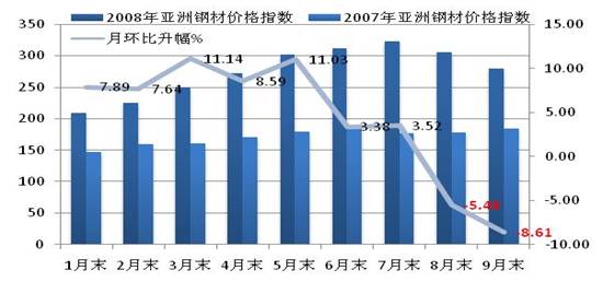 亞洲地區(qū)經濟增長迅猛,在需求強勁增長和原燃材料價格大幅上升的推動下,1-7月亞洲市場鋼材價格迅速上升,至7月末CRU亞洲鋼材價格指數(shù)達到323.1點,同比上升82.23%,比北美地區(qū)和歐洲地區(qū)升幅分別高5.9和37.4個百分點。受美國次貸危機引發(fā)的金融風暴影響,以及中國舉辦奧運會以及自然災害等多重因素的共同作用下,8-9月中國市場鋼材價格急劇滑落,并帶動亞洲市場鋼材綜合價格指數(shù)呈現(xiàn)為明顯的下跌態(tài)勢,至9月末,價格指數(shù)降至279.1點,同比上升51.77%。1-9月平均價格指數(shù)為258.7點,同比上升75.27%。