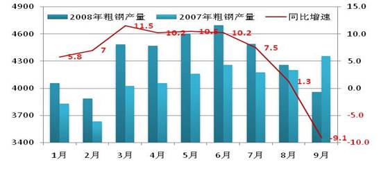 1、全球經濟增長趨緩,國際、國內兩個市場需求有所下降。國內經濟增長呈回落態(tài)勢,一季度GDP增長10.6%,二季度GDP增長10.1%,三季度GDP增長9.9%,經濟增長速度逐季回落,已由偏熱轉向穩(wěn)定區(qū)間。雖然需求將有所回落,但預計資源供給數(shù)量減少得更快,1-9月累計產鋼3.91億噸,平均日產水平142.7萬噸,但9月份粗鋼3961.42萬噸,同比指數(shù)首次降為負數(shù),日產水平僅為132.05萬噸,以此測算后四季度粗鋼產量約為1.21億噸,預計全年產鋼5.12億噸,比上年增加2320萬噸,增長4.74%,比上年粗鋼產量增速降低了11個百分點?傮w國內鋼鐵市場不會出現(xiàn)嚴重供大于求。