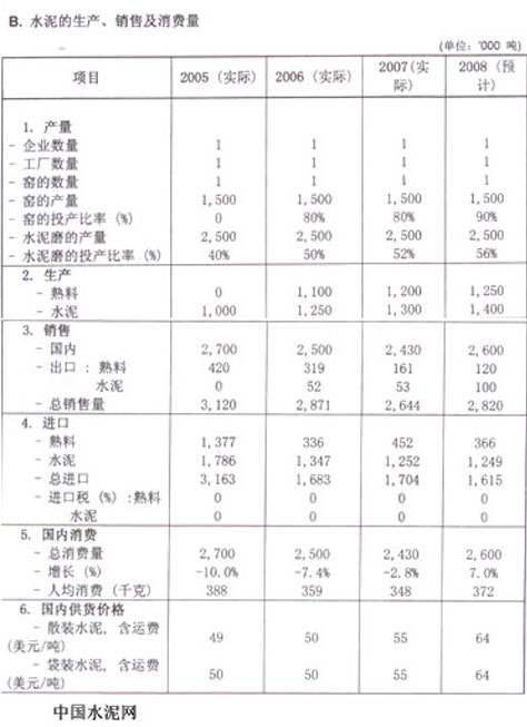2007年水泥用量為243萬噸,對比2006年下跌6%。我們預計2008年將會有大約7%的升幅,至260萬噸,人均消耗量為373公斤,仍處于極低水平。