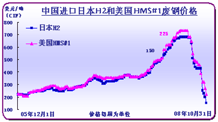 10月份國際廢鋼市場跌幅超過中國,粗略統(tǒng)計(jì),國內(nèi)廢鋼價(jià)格月末較月初跌幅46.3%,而國際市場,日本H2號(hào)廢鋼CIF到中國主要港口跌幅58%,美國破碎料CIF到中國主要港口跌幅42.5%,報(bào)價(jià)230美元/噸,但實(shí)際成交價(jià)格已經(jīng)在200美元/噸以內(nèi)。