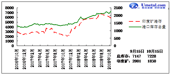 由生鐵產(chǎn)量折算9月全國共需求鐵礦石6006萬噸,但9月全國進口鐵礦石3920萬噸,同比增長18%;國產(chǎn)鐵礦石2917萬噸,同比增長3%(統(tǒng)計數(shù)據(jù)原礦石產(chǎn)量6482萬噸,原礦石品位以30%計算),則國內(nèi)外鐵礦石供應合計6837萬噸,超過需求800萬噸之多。