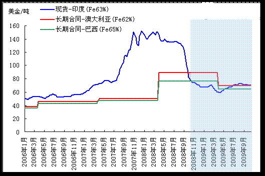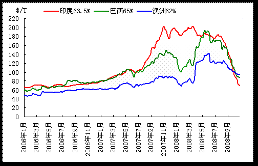 2008年世界金融危機(jī)席卷全球,中國宏觀政策轉(zhuǎn)向,原油,礦石等大宗商品價(jià)格大起大落,令未來中國經(jīng)濟(jì)走向不確定性增加,回顧2008年,展望2009年,中國鋼鐵等實(shí)體經(jīng)濟(jì)行業(yè)預(yù)期不明,鐵礦石市場(chǎng)預(yù)期同樣如同霧里看花,正在進(jìn)行的2009年度鐵礦石價(jià)格談判形勢(shì)則更為波云詭譎,各方對(duì)09年預(yù)期分歧也是最為混沌的一年。 08年鐵礦石價(jià)格非理性的上漲和下跌 2008年,中國鐵礦石市場(chǎng)經(jīng)歷了如同中國證券市場(chǎng)一樣的大起大落,從07年8月至08年1月的4個(gè)月中,中國進(jìn)口現(xiàn)貨鐵礦石價(jià)格上漲了80%-90%,而在北京奧運(yùn)會(huì)結(jié)束后,又雪崩式下跌,其過程更為短暫,前后不到3個(gè)月時(shí)間,跌幅就達(dá)到60-65%,回顧過這樣山車式的行情,即有非理性的上漲,也有非理性的下跌。 2008年鐵礦石價(jià)格談判期間,中國和世界鋼材價(jià)格,國際鐵礦石海運(yùn)費(fèi)均處于歷史最高水平,2008年國際鐵礦石價(jià)格獲得了出人意料的漲幅,而澳大利亞礦山公司更是得到了海運(yùn)費(fèi)補(bǔ)償,澳洲粉礦離岸價(jià)格較巴西礦額外上漲14.88%。而此時(shí)美國次貸危機(jī)尚未引起金融風(fēng)暴,世界經(jīng)濟(jì)走軟的跡象也不明顯,業(yè)內(nèi)普遍樂觀的預(yù)測(cè)中國08年GDP增長(zhǎng)仍將保持10%增長(zhǎng),原材料價(jià)格仍會(huì)保持高位運(yùn)行,09年長(zhǎng)期合同仍會(huì)上漲。 中國進(jìn)口澳洲/巴西/印度鐵礦石到岸價(jià)格(CIF):