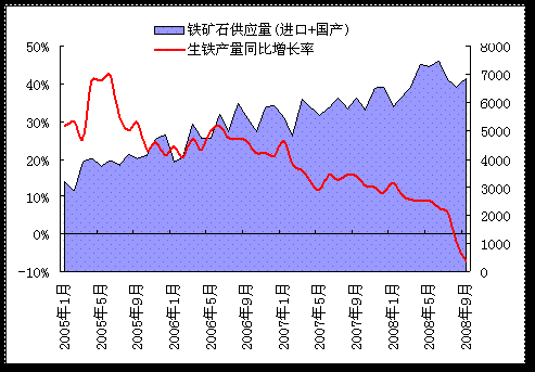 2008年鐵礦石市場(chǎng)明顯的供大于求 事實(shí)上,從2008年4月開始,中國進(jìn)口和國產(chǎn)鐵礦石(以29%品位原礦計(jì)算)合計(jì)供應(yīng)量一直大于需求量(見下表),08年2季度供應(yīng)超過需求1659萬噸,3季度超過需求1086萬噸。如果考慮沒有統(tǒng)計(jì)在內(nèi)的地方小礦山產(chǎn)量(中鋼協(xié)估計(jì)其生產(chǎn)規(guī)模為1億噸原礦/年),08年1-3季度中國鐵礦石供應(yīng)超過需求在4000萬噸以上,供求比為107:100。而08年11月統(tǒng)計(jì)全國港口鐵礦石庫存約9000萬噸,比08年1月的4600萬噸多出4400萬噸。 另據(jù)RMG數(shù)據(jù)顯示,2008年1-3季度全球鐵礦石產(chǎn)量增增長(zhǎng)9%,鐵礦石出口貿(mào)易量增長(zhǎng)8%,但I(xiàn)ISI最新統(tǒng)計(jì)1-3季度全球生鐵產(chǎn)量為7.28億噸,僅增長(zhǎng)4%,其中中國生鐵產(chǎn)量增長(zhǎng)5.8%。 以上跡象在08年7-8月已經(jīng)明顯體現(xiàn)出來,但許多觀點(diǎn)認(rèn)為北京奧運(yùn)會(huì)期間,眾多工廠、建筑工地因環(huán)保原因停產(chǎn),物流環(huán)節(jié)受到限制,鋼材市場(chǎng)又逢傳統(tǒng)淡季,因此國內(nèi)鋼材需求疲軟,鐵礦石滯銷這些困難都是暫時(shí)性的,待奧運(yùn)會(huì)結(jié)束后建筑,機(jī)械等行業(yè)復(fù)蘇,將推動(dòng)鋼材市場(chǎng)重振旗鼓,鐵礦石市場(chǎng)自然也會(huì)絕處逢生。 2008年1-9月中國鐵礦石供需數(shù)據(jù):