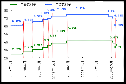 中國貨幣政策惡果與不期而遇的金融風(fēng)暴 08年3月美國投行貝爾斯登倒閉時(shí),金融風(fēng)暴有多強(qiáng),是否會(huì)蔓延到實(shí)體經(jīng)濟(jì),是否會(huì)影響經(jīng)濟(jì)高速發(fā)展的中國都是未知數(shù)。到9月,形勢(shì)則已完全明朗,美林被收購,雷曼申請(qǐng)破產(chǎn),摩根和高盛轉(zhuǎn)型為商業(yè)銀行,華爾街五大投行全部垮臺(tái)。截止到11月,美國共18家銀行,235家金融機(jī)構(gòu)有倒閉風(fēng)險(xiǎn)。 美國批準(zhǔn)7000億美金的救市計(jì)劃后的一個(gè)月內(nèi),歐洲各國緊急救市計(jì)劃資金總額達(dá)到了2萬億之多,問題的嚴(yán)重性逐漸暴露。越來越多的研究機(jī)構(gòu)認(rèn)為本輪世界經(jīng)濟(jì)走軟,并不是一個(gè)短暫的調(diào)整,而是一個(gè)有深度,有長(zhǎng)度的周期性回落。 金融風(fēng)暴將危及實(shí)體經(jīng)濟(jì)的觀點(diǎn)深入人心,中國出口經(jīng)濟(jì)占GDP近40%,同樣難以幸免。利用聯(lián)合國世界經(jīng)濟(jì)聯(lián)結(jié)模型中國計(jì)量經(jīng)濟(jì)模型估計(jì),我國出口對(duì)美、日、歐盟GDP的彈性分別為4.1,4.7和3.5。這世界經(jīng)濟(jì)每減速1%。統(tǒng)計(jì)局?jǐn)?shù)據(jù)顯示,中國08年1-9月GDP較上年同期增長(zhǎng)9.9%,增速大大低于上年同期修正后的12.2%。 而07年至08年上半年,中國宏觀調(diào)控取向?yàn)?“防通脹、防過熱”,制定了從緊的貨幣政策,2007年經(jīng)歷了6次加息,直到08年9月金融風(fēng)暴席卷全球,才四年來首次降息。但長(zhǎng)時(shí)間的銀根緊縮,已使許多鋼鐵企業(yè)資金運(yùn)轉(zhuǎn)不暢,08年4季度開始又遭遇全球經(jīng)濟(jì)危機(jī)折磨,恐慌和需求疲軟因素共同作用,導(dǎo)致中國鋼鐵和鐵礦石市場(chǎng)崩潰。 世界范圍鋼鐵和鐵礦石行業(yè)在短時(shí)間內(nèi)信心全失,競(jìng)相減產(chǎn),全球前20位的鋼廠中:Mittal宣布減產(chǎn)15%;POSCO不銹鋼減產(chǎn)1/3;Magnitogorsk減產(chǎn)15%裁員10%;Nucor四座電爐輪流關(guān)停3周;Tata-Corus減產(chǎn)20%;河北鋼鐵、山東鋼鐵分別宣布減產(chǎn)20%,寶鋼則延長(zhǎng)了1號(hào)高爐檢修時(shí)間,新日鐵和JFE也宣布即將減產(chǎn),唯一還未有動(dòng)作的只有蒂森-克虜伯。 2007年至今中國利率變化: