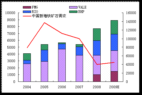 2009年鐵礦石供求關(guān)系何去何從 世界金融危機(jī)和鋼材市場(chǎng)疲軟,只是08年鐵礦石價(jià)格大幅度下跌的導(dǎo)火索,其本質(zhì)因素則是供應(yīng)嚴(yán)重大于需求的事實(shí)。08年四季度中國和世界鋼廠紛紛減產(chǎn),如果2009年世界各大礦山仍按照原計(jì)劃生產(chǎn),新興鐵礦項(xiàng)目繼續(xù)開工,未來鐵礦石市場(chǎng)供需將更為失衡。 據(jù)資料顯示,世界各國對(duì)鐵礦資源開發(fā)的投資從2002年的30億美元左右增加到目前的400億美元,包括FMG,Hopedowns投資10多億美金新礦山,保守估計(jì)這兩大礦山09年產(chǎn)能合計(jì)將達(dá)4000萬噸,比08年增長(zhǎng)100%,另2008年1-3季度VALE,RIO和BHP三大礦山產(chǎn)量增長(zhǎng)分別為8%,15%和17%,以此計(jì)算2009年三家公司產(chǎn)量增長(zhǎng)合計(jì)將在8000萬噸以上。綜合中國鋼鐵企業(yè)近年來在海外投資的大小項(xiàng)目,2009年世界鐵礦石供應(yīng)將至少增加1億噸。 按照2008年1-3季度中國生鐵6%的增長(zhǎng)速度,2009年如仍然維持這一水平,全年新增鐵礦石需求為4800萬噸,遠(yuǎn)遠(yuǎn)低于供應(yīng)預(yù)期,考慮到2008年將有3000-4000萬噸未消耗掉的鐵礦石將累計(jì),2009年世界新增產(chǎn)能與需求可能將是13000萬噸對(duì)5000萬噸,表觀計(jì)算結(jié)果非常嚴(yán)峻。 新增鐵礦石產(chǎn)能與新增需求對(duì)比: