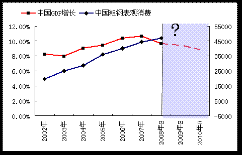 2008年第四季度,世界金融危機(jī)在全球范圍內(nèi)繼續(xù)擴(kuò)大,為防止中國經(jīng)濟(jì)受到?jīng)_擊,中國政府在過去的2個月內(nèi)出臺了一系列刺激經(jīng)濟(jì)的宏觀政策,和直接投資于基礎(chǔ)設(shè)施建設(shè)的龐大計(jì)劃。 據(jù)統(tǒng)計(jì),到9月份為止,中國CPI續(xù)五個月回落,雖然通貨膨脹壓力日益減輕,經(jīng)濟(jì)減速卻愈加明顯,前三季度GDP增幅已經(jīng)下滑到個位數(shù)(增速為9.9%),第三季度GDP增幅更是降至9%,。為防止經(jīng)濟(jì)過快下滑,2008年9月15日,中國人民銀行4年來首次宣布降低貸款利率,隨后的1個多月內(nèi)又連續(xù)2次降息。 盡管連續(xù)降息短期可能內(nèi)不會見到明顯的提振投資或消費(fèi)的效果,但政府貨幣政策的明確信息,是穩(wěn)定信心的關(guān)鍵。11月9日中國政府宣布對財政和貨幣政策進(jìn)行重大調(diào)整,由穩(wěn)健的財政政策和從緊的貨幣政策轉(zhuǎn)為積極的財政政策和適度寬松的貨幣政策,這次也是中國10多年來貨幣政策中首次使用“寬松”的說法。 另外,11月12日國務(wù)院常務(wù)會議決定,自12月1日起進(jìn)一步提高勞動密集型產(chǎn)品、機(jī)電產(chǎn)品等3770項(xiàng)產(chǎn)品的出口退稅率,取消部分鋼材、化工品和糧食的出口關(guān)稅。國家再次動用出口退稅率這一調(diào)控工具,距離上一次大范圍提高勞動密集型和高技術(shù)含量、高附加值商品出口退稅率還不到一個月。目前,出口經(jīng)濟(jì)占中國GDP總量的37-40%,集中出臺的關(guān)稅政策,展示了政府刺激出口拉動經(jīng)濟(jì)的政策導(dǎo)向,而此次調(diào)整涉及3770項(xiàng)產(chǎn)品,約占全部出口產(chǎn)品總數(shù)的27.9%。 在貨幣政策,關(guān)稅政策等宏觀調(diào)宏措施的同時,國務(wù)院還通過了金額龐大的直接投資計(jì)劃,用于加強(qiáng)基礎(chǔ)設(shè)施建設(shè),拉動中國經(jīng)濟(jì)增長。10月24日,國務(wù)院率先批復(fù)了2萬億元的鐵路建設(shè)計(jì)劃,其中,在建的投資規(guī)模超過1.2萬億元。 而在11月5日的國務(wù)院常務(wù)會議上,又確定了當(dāng)前進(jìn)一步擴(kuò)大內(nèi)需、促進(jìn)經(jīng)濟(jì)增長的十項(xiàng)措施。初步匡算,到2010年底這些設(shè)施建設(shè)約需投資4萬億元。為加快建設(shè)進(jìn)度,會議決定,2008年四季度先增加安排中央投資 1000億元,2009年災(zāi)后重建基金提前安排200億元,帶動地方和社會投資,總規(guī)模達(dá)到4000億元。十項(xiàng)措施包括: 一、加快建設(shè)保障性安居工程。 在最近的一次11月12日國務(wù)院常務(wù)會議,決定調(diào)整3770項(xiàng)產(chǎn)品的出口退稅率同時,又批準(zhǔn)了一批固定資產(chǎn)投資項(xiàng)目,包括西氣東輸二線項(xiàng)目東段工程,總投資930億元;總投資955億元的廣東陽江核電工程和浙江秦山核電廠擴(kuò)建工程;總投資174億元的一批水利樞紐工程民用機(jī)場項(xiàng)目。 中國GDP增長與粗鋼表觀消費(fèi):