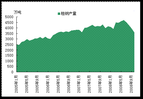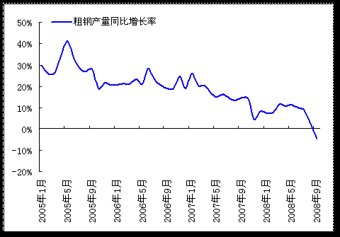 以上促進(jìn)經(jīng)濟(jì)增長的政策,對汽車、家電、機(jī)械等鋼鐵下游產(chǎn)業(yè)的增長會有積極的影響,給正處于困境中的中國鋼鐵業(yè)及鐵礦石市場帶來了希望,最直接而立竿見影的效果將是市場信心的提振和市場預(yù)期的改善,而后由下游行業(yè)拉動的復(fù)蘇,將帶來鋼材需求實(shí)實(shí)在在的回升。 據(jù)估計(jì),政府投向保障性住房、交通、機(jī)場等基礎(chǔ)設(shè)施,直接與間接拉動鋼材需求1億噸左右。這其中有5000萬噸鋼材需求將在2009年一、二季度釋放出來,可以抵消2009年、2010年房地產(chǎn)、汽車、機(jī)械、造船等行業(yè)需求下滑產(chǎn)生的負(fù)面影響。而2008年四季度中央政府還有1000億元的追加投資,以及災(zāi)后重建產(chǎn)生的3700億鋼材需求。 2008年第三季度開始,全國各鋼鐵企業(yè)開始大規(guī)模停產(chǎn)、限產(chǎn),到10月全國粗鋼產(chǎn)量已下降到3590萬噸,連續(xù)4個月下降,達(dá)到了2年多以來的最低點(diǎn),客觀上也在加快調(diào)整中國鋼材供求關(guān)系,對鋼鐵市場復(fù)蘇有積極作用。未來鋼鐵行業(yè)可能將在需求重起,產(chǎn)能回落,政策扶持的共同作用下重重整旗鼓,恢復(fù)速度可能比預(yù)期更快。 但JP摩根11月發(fā)布的報告稱,因鋼鐵公司削減產(chǎn)量,以及政府的經(jīng)濟(jì)刺激方案,預(yù)計(jì)鋼鐵價格將于2009年第一季度開始見底回升,2008年后兩個季度需求和定價環(huán)境仍然十分艱難。其他多家研究機(jī)構(gòu)對鋼鐵行業(yè)未來,及中國救市措施與金融風(fēng)暴博弈勝負(fù),尚存疑慮,因此2009年鋼鐵行業(yè)運(yùn)行態(tài)勢,是否存在反彈,何時出現(xiàn)反彈分歧較大。 中國粗鋼產(chǎn)量同比增長率月度統(tǒng)計(jì):